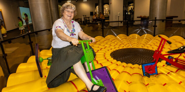 A mural depicts an octopus, named OctPi, who’s a graffiti artist. With one tentacle, OctoPi paints the wave equation, a method to describe how waves — of water, mild and the like — ripple and alter. The exhibit show notes, “The ripples created by the inexperienced paint dripping from OctoPi’s bucket are described by this equation!”