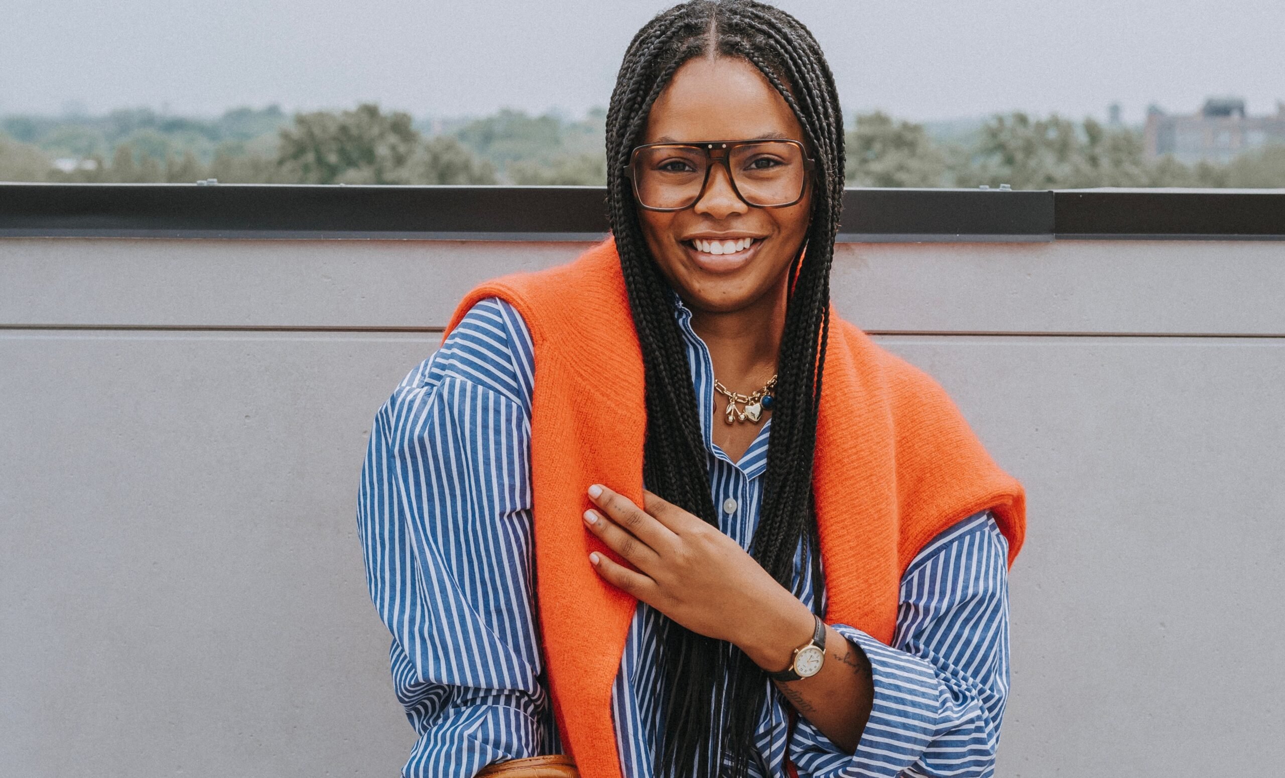 Shirt: Everlane. Sweater: ASOS. Denims: Madewell. Glasses: Jimmy Fairly. Watch: “hand-me-down from my mother.” Purse: classic.