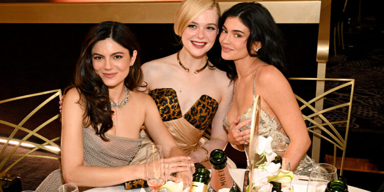 Kylie Jenner, Elle Fanning, Monica Barbaro in the course of the 82nd Annual Golden Globes held at The Beverly Hilton on January 05, 2025 in Beverly Hills, California. (Picture by Christopher Polk/GG2025/Penske Media through Getty Pictures)