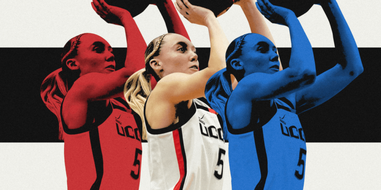 (Illustration: Demetrius Robinson / The Athletic; photograph of Paige Bueckers: David Butler II / Imagn Photographs)