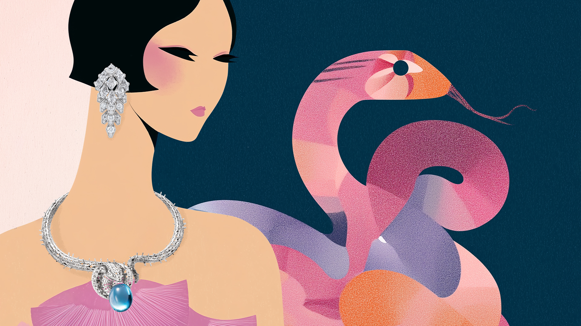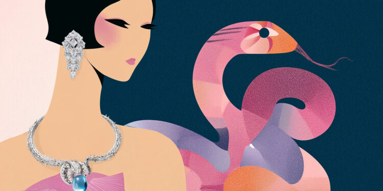 The newly realised items recall a surreal carnival of classic glamour, the place feathers and jewels glimmer beneath the haze of champagne decadence. Flamingos, poised mid-dance, grow to be echoes of Cartier’s opulence, whereas serpents command by shadow, their sensual kinds mirrored in rings and necklaces that coil across the physique. Right here, decoration is revered as a language as previous as life itself.