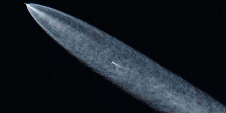 A SpaceX Falcon 9 rocket with a payload of 20 Starlink satellites is seen within the night sky above Lawndale, Calif., after being launched from Vandenberg Area Drive Base on June 18, 2024.