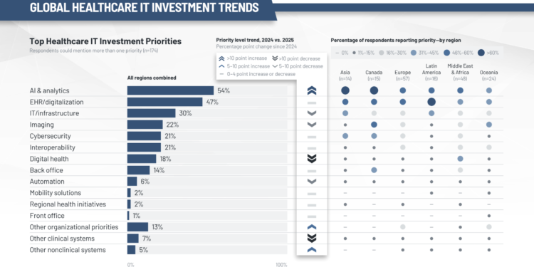 The deal with AI and analytics has seen a dramatic enhance prior to now two years. In 2023, information analytics was the sixth-most talked about funding precedence, rising to 3rd in 2024 and now claiming the highest spot in 2025. This development is fueled by the rising recognition of AI’s potential to enhance medical and administrative workflows, with functions in areas corresponding to documentation, radiology, and illness detection. Whereas curiosity in AI is excessive, many organizations are nonetheless within the early phases of adoption, specializing in testing options and establishing governance buildings.