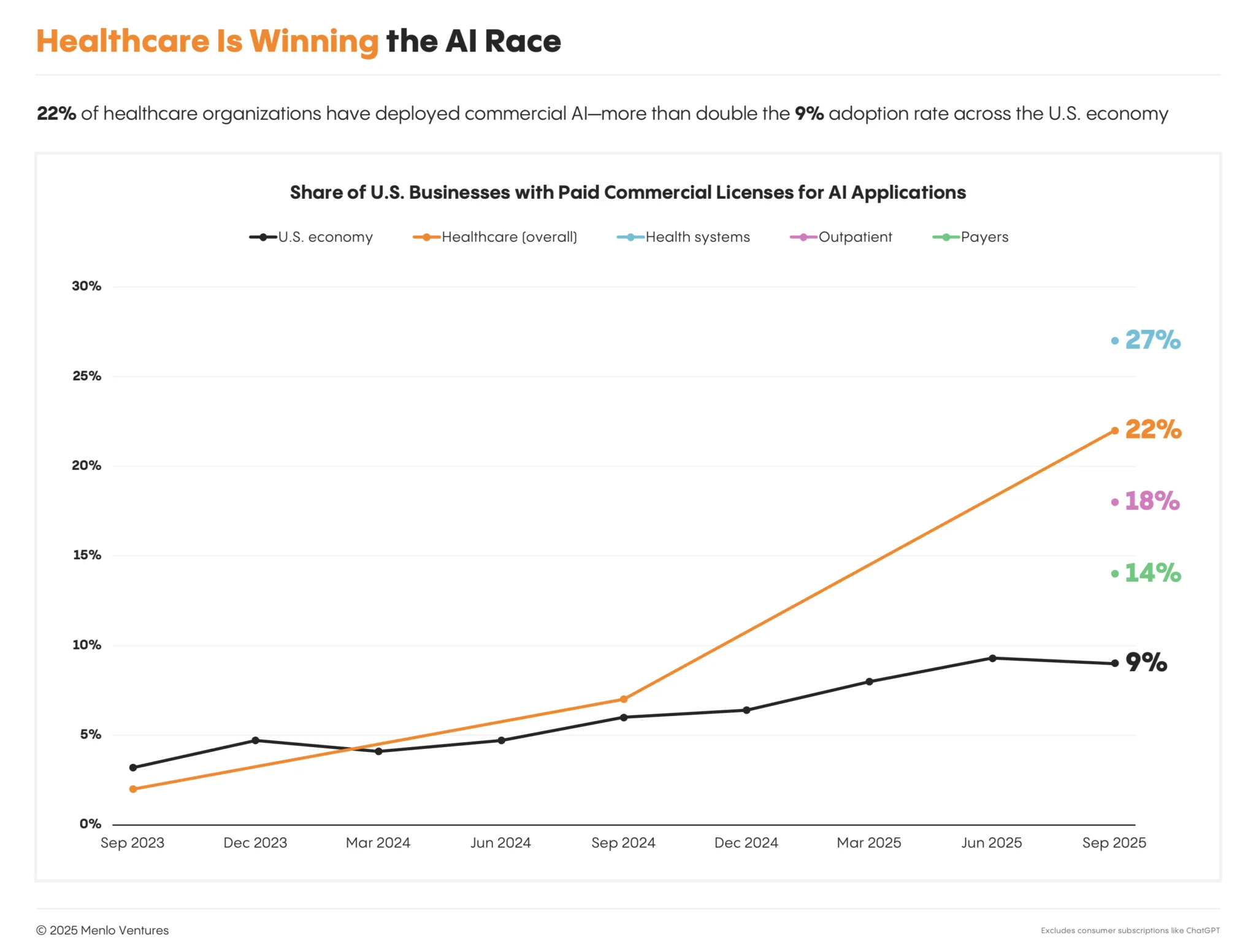 • Adoption Management: Healthcare has flipped the script, now adopting AI 2.2x quicker than the broader economic system. 22% of healthcare organizations have deployed domain-specific AI options, a large 7x enhance over 2024. Well being programs are main the cost at 27% adoption, outpacing outpatient suppliers (18%) and payers (14%).