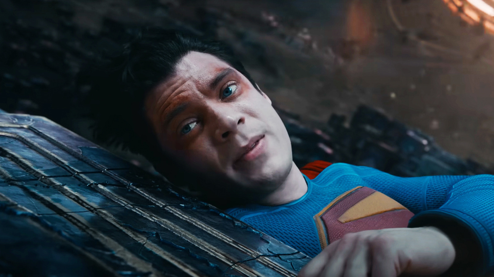 David Corenswet's Superman looks up while laying on pocket universe structures in Superman