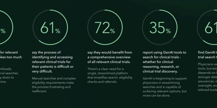– Based mostly on a survey of 100 U.S.-based healthcare professionals, the report reveals that 61% of physicians discover the method of figuring out and accessing related scientific trials troublesome, and 72% particularly discover scientific trial searches too time-consuming, in the end delaying entry to modern therapies for sufferers.