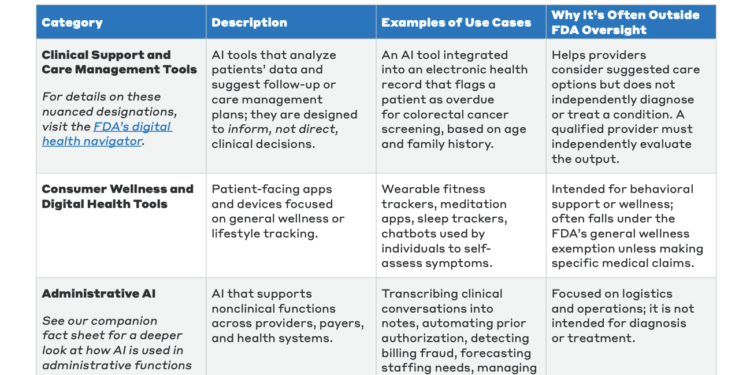 – A brand new report from the Bipartisan Policy Center (BPC) examines the advanced and sometimes fragmented regulatory panorama for well being AI tools that fall exterior the jurisdiction of the U.S. Meals and Drug Administration (FDA). As AI turns into more and more embedded in healthcare—automating administrative duties, guiding scientific selections, and powering client wellness apps—these instruments function inside a patchwork of federal guidelines, state legal guidelines, and voluntary business requirements.