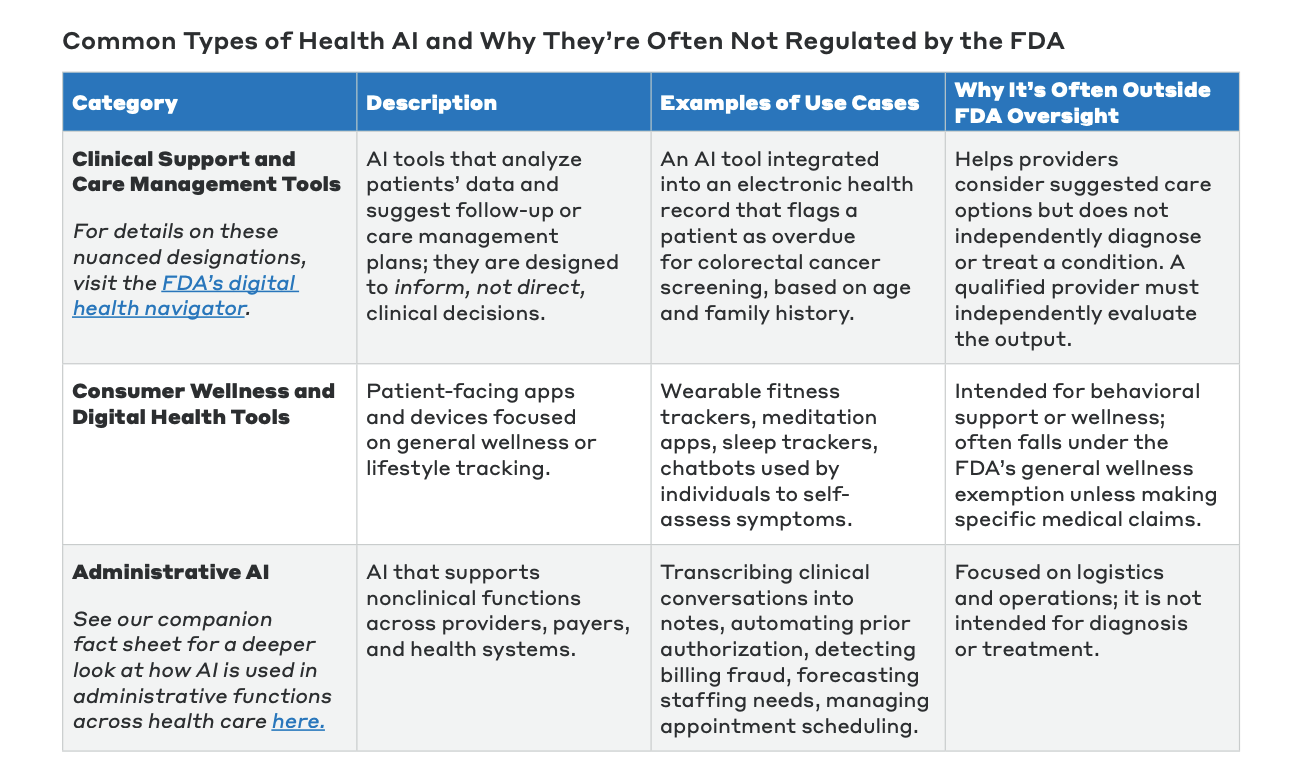 Whereas AI instruments designed to diagnose, forestall, or deal with illness are regulated by the FDA as medical gadgets, a big and rising class of well being AI operates exterior of this formal oversight. These instruments are as an alternative ruled by a mixture of insurance policies from businesses just like the Division of Well being and Human Providers (HHS), the Federal Commerce Fee (FTC), and numerous state authorities.