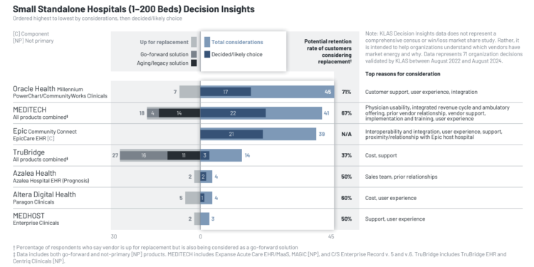 Regardless of having essentially the most net-new small hospital wins between 2021 and 2023, Oracle Well being acquired the bottom worth rating among the many distributors evaluated within the KLAS report. This dissatisfaction stems from issues about sudden prices for extra modules and customizations, in addition to challenges with implementation and coaching.