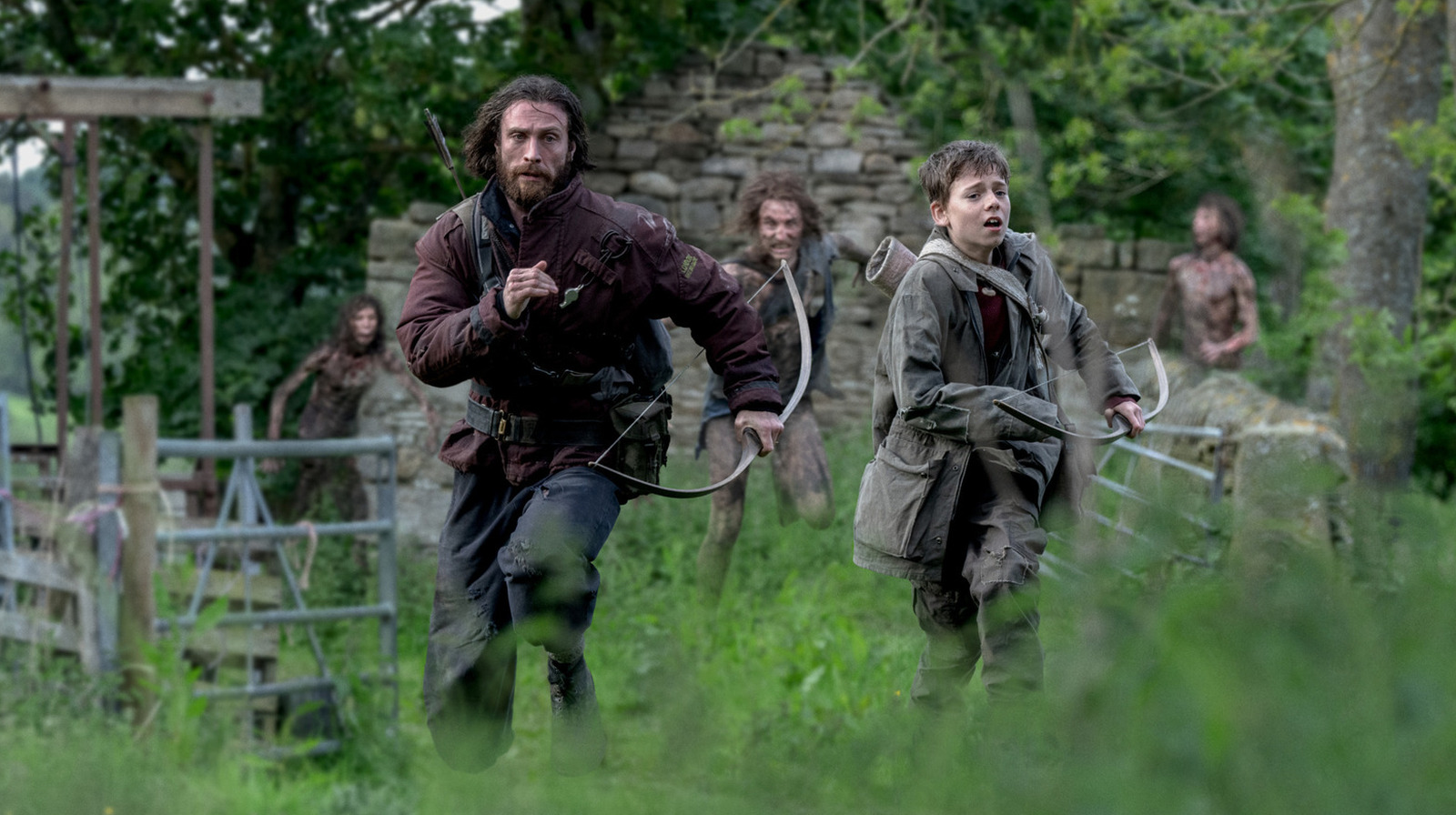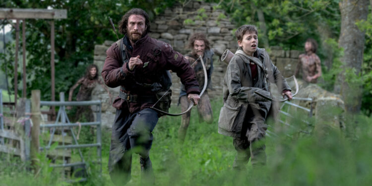 Aaron Taylor-Johnson as Jamie and Alfie Williams as his son Spike running away from infected in 28 Years Later