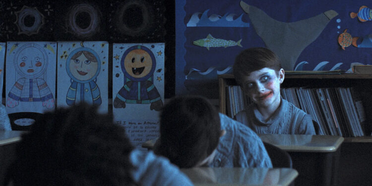 Alex smiling creepily with clown makeup on in the classroom in Weapons