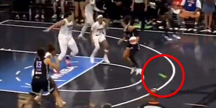 An grownup machine thrown onto the courtroom disrupts play late within the fourth quarter of the Atlanta Dream’s recreation towards the Golden State Valkyries. WNBA