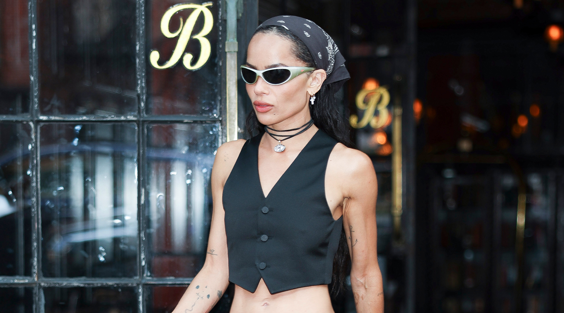 In customized Saint Laurent, Kravitz wore a sharply tailor-made, black satin cropped vest with a deep V-neckline and minimalist reduce that introduced a sultry replace to a basic work staple. Whereas waistcoats are an extremely versatile piece, in a position to be layered with ease, she took the chance to indicate off her midriff by carrying it by itself. Beneath, she contrasted the vest’s precision with free, slouchy pinstripe trousers that hung effortlessly off her hips.